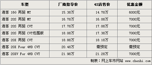 逍客是在國內上市的第一款真正意義上的跨界車,它同時也是日產歐洲設計中心成立之后開發(fā)的第一款新車,既擁有SUV的時尚外觀和越野性,又有轎車的舒適性和省油優(yōu)勢。根據(jù)網(wǎng)上車市價格監(jiān)測系統(tǒng)顯示,目前逍客全系最高優(yōu)惠7000元,具體車型以及價格如下: