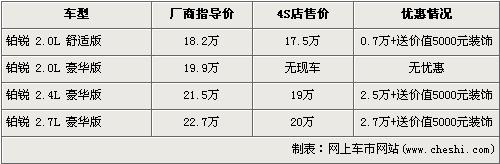 據(jù)北京克萊斯勒4s店銷售人員介紹,克萊斯勒鉑銳已經(jīng)停止進口,除了2.0L 豪華版已沒有庫存車外,經(jīng)銷店內(nèi)還剩部分其他車型庫存車。經(jīng)7000元優(yōu)惠后,2.0L舒適版的售價從18.2萬元下降到了17.5萬元。2.4L豪華版經(jīng)2.5萬元優(yōu)惠后,售價降到了19萬元。全系最高配的2.7L豪華版經(jīng)2.7萬元優(yōu)惠后,售價下降到了20萬元。購買鉑銳的消費者在得到現(xiàn)金優(yōu)惠的同時,還可以得到價值5000元的內(nèi)部裝飾。