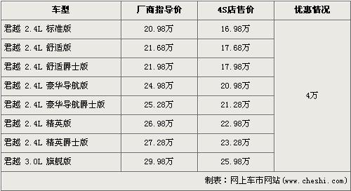 今年的7月8日,別克終于推出了帶著家族新元素特征的中級車市場的又一力作-新君越。新君越的加入無疑給別克軍團再次打了一針“興奮劑”,其與新君威形成了很好的市場互補。別克經銷店已經可以接受新君越的預訂工作,訂金為10萬元,并且為了清理老款君越的庫存車,老君越出現(xiàn)了全系降4萬元的優(yōu)惠,具體價格請看下表: