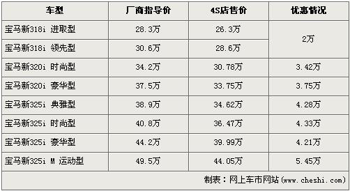 新寶馬3系在去年12月份正式在國內(nèi)市場正式上市銷售,經(jīng)過改款后的3系從外觀的流線,到內(nèi)飾的風(fēng)格均有一定程度的變化,帶給消費者的是全新的視覺沖擊和駕馭樂趣。根據(jù)網(wǎng)上車市價格監(jiān)測系統(tǒng)顯示,新寶馬3系車型全系出現(xiàn)了不同的現(xiàn)金優(yōu)惠,最高優(yōu)惠達到了5.45萬元,具體車型價格如下: