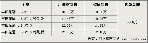 國產(chǎn)花冠已經(jīng)是其第九代產(chǎn)品,尤其值得稱道的是其VVT-i發(fā)動(dòng)機(jī),這是豐田國產(chǎn)車型中首款采用此發(fā)動(dòng)機(jī)的車型。國產(chǎn)后這款車的表現(xiàn)依然如日中天,成為一汽豐田的看家產(chǎn)品。根據(jù)網(wǎng)上車市價(jià)格監(jiān)測系統(tǒng)顯示,目前花冠全系車型出現(xiàn)了5000元的優(yōu)惠幅度,具體車型以及優(yōu)惠如下: