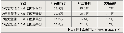 歐藍(lán)德是三菱汽車第一款采用轎車底盤形式生產(chǎn)的SUV,沿用了三菱Lancer(藍(lán)瑟)轎車的平臺(tái),具有轎車乘坐的舒適性,同時(shí)它又有SUV的特性。根據(jù)網(wǎng)上車市價(jià)格檢測(cè)系統(tǒng)顯示,目前歐藍(lán)德車型主要為09款車型,最高讓利達(dá)1.7萬(wàn)元。具體車型以及價(jià)格如下: