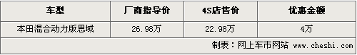 隨著油價(jià)的不斷上調(diào),消費(fèi)者的用車成本不斷增加,混合動(dòng)力車型開始成為許多消費(fèi)者選購的對(duì)象,其中本田進(jìn)口的混合動(dòng)力版思域在性價(jià)比方面逐漸凸顯其優(yōu)勢(shì),目前筆者了解,這款車最高優(yōu)惠幅度達(dá)到了4萬元,優(yōu)惠后與普通車型差距逐漸減小,具體車型以及價(jià)格如下: