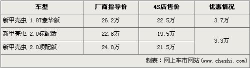 甲殼蟲是一款出自于PQ34平臺(tái)的轎車,它與我們熟知的高爾夫共平臺(tái)生產(chǎn)。不過在國內(nèi),它的“身份”卻被提升了很多,絕對(duì)的超過高爾夫的價(jià)格。正因這是一款小眾車型,所以它顯得彌足珍貴,再加上甲殼蟲圓潤、小巧、動(dòng)感的外形,所以它給我們的印象非常親切。近日據(jù)網(wǎng)上車市價(jià)格系統(tǒng)監(jiān)測(cè)顯示,甲殼蟲出現(xiàn)了最高3.7萬元的優(yōu)惠,具體價(jià)格詳情請(qǐng)看下表: