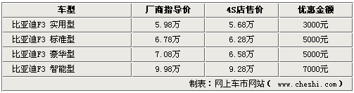 比亞迪F3系列車市一直都是自主家用車市場中的寵兒,在推出了白金版以及全新的智能性車型之后,更是吸引了消費者的關(guān)注。網(wǎng)上車市網(wǎng)站近期又比亞迪4S店處了解到,現(xiàn)在各家店內(nèi)的車型均較為齊全,根據(jù)不同的車型最高可給出7000元的優(yōu)惠。詳情如下: