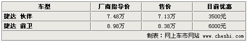 據(jù)4S店銷售人員介紹:目前捷達共有兩款車型,分為捷達伙伴和捷達前衛(wèi)。捷達伙伴目前優(yōu)惠3500元,捷達前衛(wèi)優(yōu)惠6000元。目前現(xiàn)車較為充足,但個別店內(nèi)現(xiàn)車顏色不全,如預(yù)定只需等待1周時間。在店內(nèi)做一條龍服務(wù),還可獲贈價值1000元裝飾,包括地膠、腳墊、座套等。