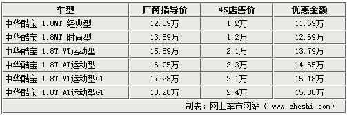 酷寶系列車型,不僅外形時(shí)尚,動(dòng)力也相當(dāng)充沛,不僅可與進(jìn)口跑車如蓮花競速相媲美,也帶動(dòng)了自主跑車市場的競爭。近期網(wǎng)上車市網(wǎng)站了解到,隨著市場競爭的加劇,現(xiàn)在北京的中華4S店內(nèi)最高可給出24000元的現(xiàn)金優(yōu)惠,令此車型再次引起關(guān)注。具體詳情如下:
