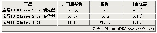 據(jù)4S店銷售人員介紹:目前寶馬X3全系3款車型全部有優(yōu)惠,最高優(yōu)惠8.1萬元。目前X3現(xiàn)車較少,僅有個別店內(nèi)有現(xiàn)車,并且每款車型只有1-2輛現(xiàn)車,顏色都僅限于黑色、銀色。如需預(yù)定需等半個月至3個月不等。目前X3部分車型正在運輸途中,等待時間不會非常長,如感興趣的朋友請盡快與店內(nèi)取得聯(lián)系。