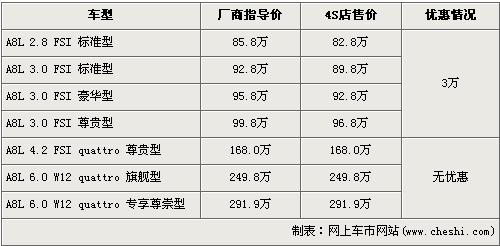 據(jù)北京奧迪經(jīng)銷店銷售人員介紹,2.8L和近期剛上市的3.0L店內(nèi)有現(xiàn)車,并且購買的消費(fèi)者可以得到3萬元的優(yōu)惠。經(jīng)優(yōu)惠后,全系最低配的2.8 FSI標(biāo)準(zhǔn)版售價從85.8萬元下降到了82.8萬元。銷售人員還介紹,4.2L以及6.0L Quattro版車型均無現(xiàn)車,欲購買著需交10萬訂金,等半年左右才可提車。