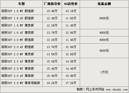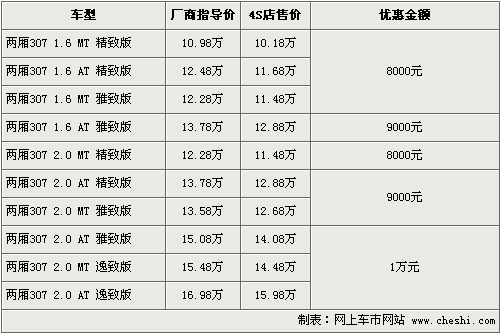 東風(fēng)標(biāo)致旗下的“大嘴”307,自在08年上市至今得到了消費者的一直認(rèn)可和喜愛。根據(jù)網(wǎng)上車市價格監(jiān)測系統(tǒng)顯示,東風(fēng)標(biāo)致將于9月17日正式推出新款標(biāo)致307,同時老款優(yōu)惠幅度進(jìn)一步加大。具體車型以及價格如下: