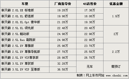 在中級(jí)車(chē)行列中,新天籟在舒適性和空間方面具有自己獨(dú)特的優(yōu)勢(shì),尤其在車(chē)內(nèi)部座椅的乘坐感受方面,可謂獨(dú)樹(shù)一幟,新天籟在一系列升級(jí)后成為消費(fèi)者選購(gòu)的熱點(diǎn)車(chē)型之一。根據(jù)網(wǎng)上車(chē)市價(jià)格監(jiān)測(cè)系統(tǒng)顯示,新天籟為增加市場(chǎng)競(jìng)爭(zhēng)力,優(yōu)惠幅度有所加大,全系最高優(yōu)惠2.2萬(wàn)元。具體行情如下: