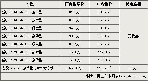 2009年9月4日,一汽-大眾奧迪銷售事業(yè)部宣布新奧迪Q7正式上市,在原有3.6 FSI、4.2 FSI兩款汽油直噴發(fā)動機(jī)基礎(chǔ)上奧迪首次將全球領(lǐng)先的3.0 TDI渦輪增壓柴油直噴發(fā)動機(jī)引入中國,使新奧迪Q7形成了包括3種排量7款車型的強(qiáng)大產(chǎn)品陣容,價(jià)格區(qū)間為81.5至165萬元。近日,奧迪Q7全系出現(xiàn)了最高25萬元的優(yōu)惠,具體價(jià)格行情請看下表: