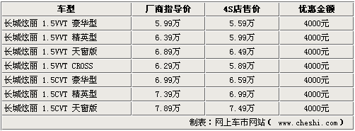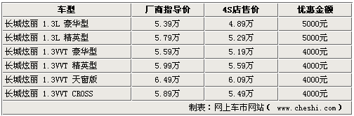 本次長城炫麗首先由廠家開始優(yōu)惠,全系車型中1.3L兩款車型官降4000元,其他車型均降3000元。而經(jīng)銷商處則可在廠家官降的基礎上再給出千元的優(yōu)惠。