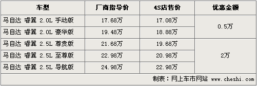 據(jù)一汽馬自達(dá)4S店銷售人員介紹,馬自達(dá)6睿翼目前全系車型最高可以優(yōu)惠現(xiàn)金2萬(wàn)元,2.5排量三款車優(yōu)惠后最低僅售19.68萬(wàn),其中2.0排量車型目前也可以優(yōu)惠現(xiàn)金5千元。本月底經(jīng)銷店內(nèi)有黑色、銀色、紫色等現(xiàn)車供應(yīng)。