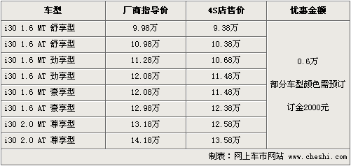北京現(xiàn)代i30在9月份正式上市,源自歐洲設(shè)計(jì)風(fēng)格的i30在外觀上非常時(shí)尚,2.65米的車身軸距足以滿足普通家庭需要,內(nèi)飾方面表現(xiàn)中規(guī)中矩,是一款典型的家庭經(jīng)濟(jì)型轎車。根據(jù)網(wǎng)上車市價(jià)格監(jiān)測系統(tǒng)顯示,北京現(xiàn)代i30現(xiàn)優(yōu)惠現(xiàn)金6千元,部分車型需預(yù)訂。具體車型價(jià)格行情如下: