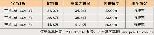 近日筆者從北京亞運(yùn)村交易市場(chǎng)獲悉,目前購(gòu)買寶馬1系轎車最高可享受3.5萬(wàn)元的現(xiàn)金優(yōu)惠,具體價(jià)格見(jiàn)下表: