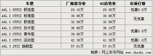 據(jù)北京一汽奧迪經(jīng)銷店銷售人員介紹:目前A4L全系現(xiàn)車比較齊全,除1.8TFSI及3.2L車型現(xiàn)車較少以外,其余車款均有現(xiàn)車。現(xiàn)車顏色主要有銀色、灰色、紅色等,如預(yù)定其他顏色車型需預(yù)定,預(yù)定最少等20天,最長等待1個半月。1.8TFSI及3.2L車型等待時間較長,需等3個月時間。優(yōu)惠方面,目前全系最高優(yōu)惠1萬元,其余車型均有8000元左右的優(yōu)惠幅度,F(xiàn)購車取消了加價,并還有一定幅度的優(yōu)惠,此時購車比較劃算,喜歡的消費者請及時與店內(nèi)聯(lián)系。