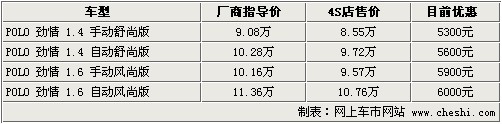 據(jù)4S店銷售人員介紹:目前POLO勁情全系僅為4款車型。之前的1.4升手動擋兩款車型合并為1.4手動舒尚版,1.4升自動擋兩款車同樣合為1.4自動舒尚版。其余1.6升兩款車型不變。目前全系最高優(yōu)惠6000元,其余三款車優(yōu)惠幅度都有所不同。目前全系現(xiàn)車比較少,個別車型僅有1-2臺現(xiàn)車。但目前有在途中車輛,最短等待1周,最長等待2周時間。我們建議購買銀色、藍色、紅色車款,這3種顏色車型預定時間短,且店內個別車型有此顏色現(xiàn)車。