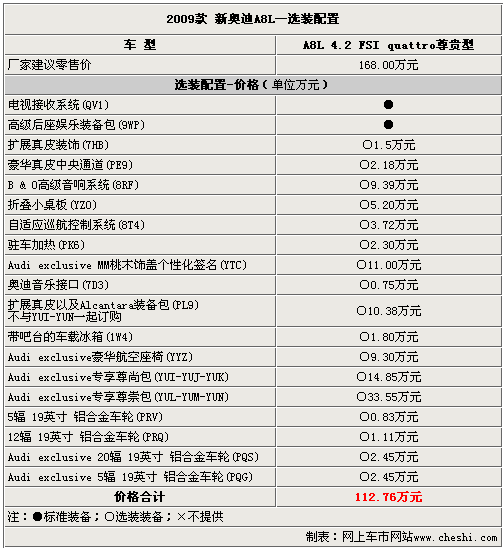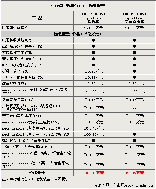 以上的選裝配置需要在預(yù)訂車輛前選擇好,經(jīng)銷商會根據(jù)客戶的訂單向廠家發(fā)送配置代碼。09款奧迪A8L的選裝配置十分豐富,完全可以滿足對配置有需求消費者的“苛刻”要求。當(dāng)然,這些配置也需要不菲的金錢才可以擁有,究竟哪些配置適合有品位懂得享受的您呢?