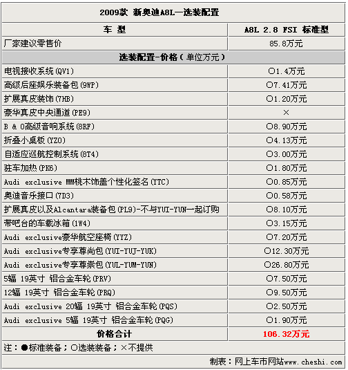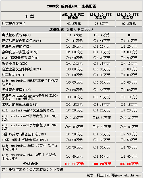 新上市的奧迪A8L 3.0FSI主打性價比,在標(biāo)準(zhǔn)配置上要高于奧迪A8L 2.8FSI。在選裝配置上,價格略低的基本型以及豪華型可以選裝所提供的全部的配置,總價均超過了百萬元。而售價接近百萬元的尊貴型除了價值1.4萬元的“電視接收系統(tǒng)”為標(biāo)準(zhǔn)配置外不必選裝,其余配置均需要選裝。
