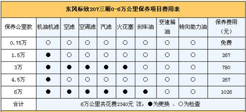 5.保養(yǎng)費(fèi): 我們向東風(fēng)標(biāo)致4S店售后服務(wù)人員咨詢過(guò),東風(fēng)標(biāo)致207 三廂保養(yǎng)周期為1.5萬(wàn)公里,首保在7500公里時(shí)進(jìn)行。免費(fèi)對(duì)各種配件進(jìn)行檢查。1.5萬(wàn)公里和4.5萬(wàn)公里時(shí)都只需要進(jìn)行普通保養(yǎng)(更換機(jī)油機(jī)濾),3萬(wàn)公里保養(yǎng)時(shí)需要更換機(jī)油機(jī)濾和三濾以及火花塞;6萬(wàn)公里時(shí)除了有和3萬(wàn)公里相同的項(xiàng)目外,還需更換剎車油。6萬(wàn)公里綜合下來(lái)下來(lái)一共需要花費(fèi)2340元,平均一年兩萬(wàn)公里保養(yǎng)費(fèi)用大概780元。