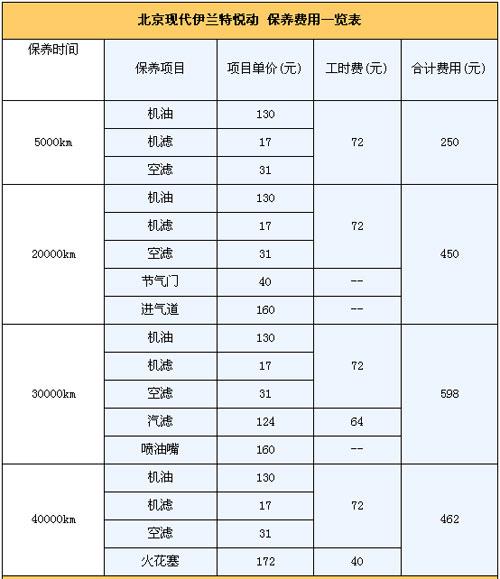 4.保養(yǎng)費(fèi):悅動(dòng)的首保為5000km,以后每次的保養(yǎng)間隔為5000km。保修政策為2年/6萬公里保修(以先到為準(zhǔn))。第二次的10000km保養(yǎng)和首保內(nèi)容相同。那么如果一年行駛2萬km,悅動(dòng)一年要做四次保養(yǎng)。由下表可知其除了第一年,以后每年的保養(yǎng)費(fèi)用1500元。