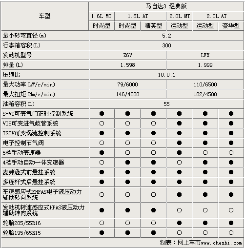 在動(dòng)力配置方面,馬3經(jīng)典版采用了1.6L排量和2.0L排量?jī)煽畎l(fā)動(dòng)機(jī),其中1.6L發(fā)動(dòng)機(jī)的最大功率和最大扭矩分別達(dá)到了79KW和146N.m。2.0L發(fā)動(dòng)機(jī)的最大功率和最大扭矩分別達(dá)到了110KW和182N.m另外,這兩個(gè)排量車型分別采用了4速手自一體和5速手動(dòng)兩款變速箱,分別可以滿足不同消費(fèi)者的要求。1.6L車型采用了15寸鋁合金輪轂,2.0L車則采用16寸鋁合金輪轂。