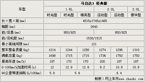 馬3經(jīng)典版全系車型的車身尺寸達(dá)到了4515 X 1745 X 1465mm;雖然這款車采用了更加運(yùn)動(dòng)的前臉,但是車身尺寸較老款車型并沒(méi)有變化,而且這款車的離地間隙為121mm,比較適應(yīng)國(guó)內(nèi)的復(fù)雜路況。由于排量的不同,這六款車的加速時(shí)間也有所區(qū)別,其中1.6L自動(dòng)擋車型的加速時(shí)間為12.8秒,2.0L手擋車型的加速時(shí)間為9.2秒。