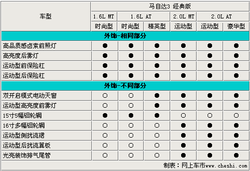 廠家為了區(qū)分各車型之間的差異,往往體現(xiàn)在車身外形設(shè)計(jì)上。馬3經(jīng)典版的2個(gè)系列車型在外觀上的差別也比較明顯,其中2.0L車型配備車身運(yùn)動(dòng)包圍、運(yùn)動(dòng)型后擾流板、光亮裝飾排氣管等運(yùn)動(dòng)套件。 值得一提的是,除兩款低配車型以外,其余四款車型均配備了雙開(kāi)啟電動(dòng)天窗和高亮度前霧燈,這兩項(xiàng)配置可以說(shuō)是新馬3經(jīng)典版增配中的一個(gè)亮點(diǎn)。
