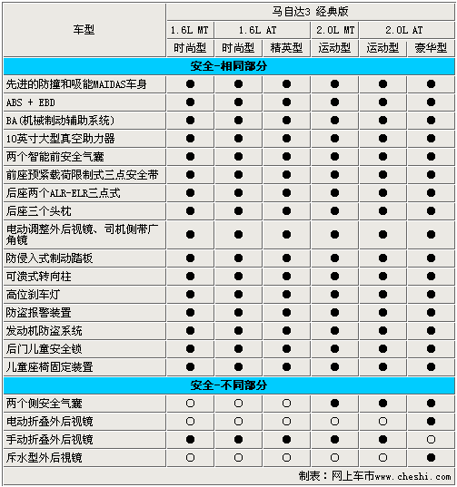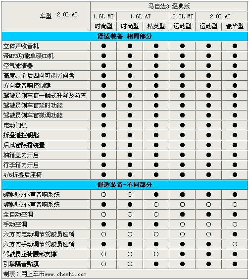 長(zhǎng)安馬自達(dá)旗下的新款三廂轎車——馬自達(dá)3經(jīng)典版于6月21日正式上市,售價(jià)為11.28萬(wàn)-14.98萬(wàn)。這款分別搭載1.6L引擎和2.0L引擎的新車,由于配置和動(dòng)力差異共分為6款車型。其中1.6手動(dòng)時(shí)尚型和1.6自動(dòng)時(shí)尚型的差價(jià)為1萬(wàn)元,而低配車型和2.0自動(dòng)豪華版車型的差價(jià)高達(dá) 3.7萬(wàn)元,那么它們之間到底有著怎樣的配置差異呢?
