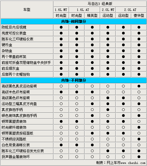在內(nèi)飾配置方面,新馬3經(jīng)典版的6款車型的配置還是比較齊全的。四門電動(dòng)車窗、室內(nèi)照明燈、防炫目后視鏡、方向盤高度可調(diào)、帶過(guò)濾清新空調(diào)等配置都可以在這幾款車中找到。不過(guò),2.0L高配車型采用了跑車式鍍鉻儀表盤、真皮座椅、迎賓踏板等配置,而2.0L手動(dòng)版車型還采用了黑色內(nèi)飾、真皮換擋手柄等配置。