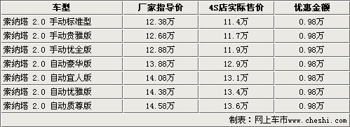 索納塔作為北京現(xiàn)代銷售的第一款車型,在中國地區(qū)銷售了已經(jīng)快7年了。隨著新車型的增加,索納塔已經(jīng)漸漸的失去了市場競爭力了。在4月的上海國際車展上,北京現(xiàn)代展出了自主研發(fā)車型新索納塔BT01,一經(jīng)亮相就立刻受到了中國消費者的關(guān)注。近日我們從北京現(xiàn)代內(nèi)部人士處獲悉到,主研發(fā)車型新索納塔BT01將于7月份正式推出。與此同時,根據(jù)網(wǎng)上車市價格監(jiān)測系統(tǒng)顯示,目前銷售的索納塔全系均出現(xiàn)了大幅優(yōu)惠,2.0標準版車型的售價僅為11.4萬。具體車型售價見下表: