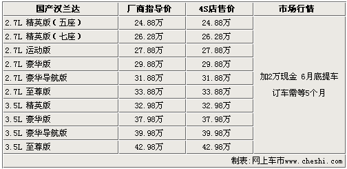 2009年5月25日,廣州豐田正式推出了SUV車型漢蘭達,售價24.88—42.98萬元。作為一款日系經(jīng)典SUV車型,這款車以進口方式銷售時就得到了廣大消費者的喜愛,此次國產(chǎn)后的漢蘭達增加了2.7升排量的車型,不僅使車系的價格較進口車型降低不少,而且還增加了消費者的選擇空間。目前國產(chǎn)漢蘭達的現(xiàn)車還沒有到店,急于提車的消費者需要加價提車。