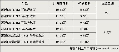 據(jù)經(jīng)銷商處銷售人員介紹,凱越HRV共有6個(gè)車型在售,近期除了舒適版現(xiàn)金優(yōu)惠仍然是2萬元外,其他4款車型的均優(yōu)惠1.8萬元。入門車型的凱越HRV 1.6LE 手動(dòng)舒適版現(xiàn)金優(yōu)惠售價(jià)仍為8.58萬元。而導(dǎo)航版與運(yùn)動(dòng)版車型優(yōu)惠1.8萬元,但是此兩版車型店內(nèi)均無現(xiàn)車,欲購買的消費(fèi)者需交訂金1萬元,最早兩周內(nèi)可以提車。