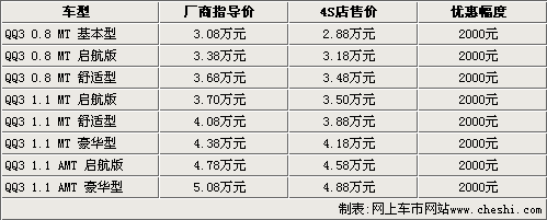 今年年初,奇瑞汽車(chē)正式推出了QQ3啟航版,共有三款車(chē)型,售價(jià)3.38-4.78萬(wàn)元。奇瑞QQ3啟航版是在原有車(chē)型的基礎(chǔ)上增加更多使用配置,而價(jià)格方面也與原車(chē)型基本保持一致。奇瑞推出的QQ3啟航版使該系列車(chē)型在性?xún)r(jià)比方面進(jìn)一步提高。據(jù)網(wǎng)上車(chē)市網(wǎng)站價(jià)格監(jiān)測(cè)系統(tǒng)顯示,奇瑞QQ3目前出現(xiàn)了一定的優(yōu)惠幅度。