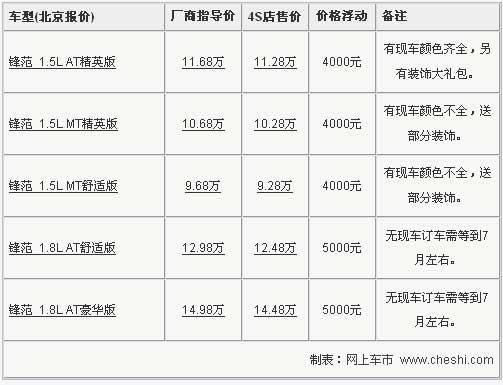 據(jù)廣汽本田4S店銷售人員介紹,目前鋒范有3千元-5千元不等的優(yōu)惠,另外近期購車還將贈(zèng)送部分裝飾,包括腳墊、座套等可供消費(fèi)者選擇。現(xiàn)車方面主要以1.5L車型為主,部分顏色及1.8L車型需要提前預(yù)訂,預(yù)訂訂金為1000元,7月左右可以提到現(xiàn)車。北京地區(qū)各4S店由于訂單不同,各店銷售的現(xiàn)車顏色有所不同。