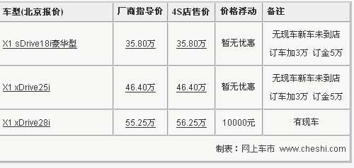 據(jù)寶馬4S店銷售人員介紹:目前寶馬X1共有三款車型,如消費(fèi)者預(yù)訂這3款車型,訂金統(tǒng)一為5萬(wàn)元。寶馬X1 28目前有現(xiàn)車,但提車需加價(jià)1萬(wàn)元。18i及25i目前無(wú)現(xiàn)車,購(gòu)車需加價(jià)3萬(wàn)元。由于X1現(xiàn)車較少,所以預(yù)定需等時(shí)間較長(zhǎng)。