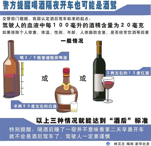 交管部門提醒,我國認定酒后駕車標準的起點是,駕駛人的血液中每100毫升的酒精含量為20毫克。從天津市以往查處情況看,如果排除個人體重、體溫、性別、年齡、人體脂肪含量、是否經(jīng)常飲酒等因素,一般喝2/5瓶普通瓶裝啤酒,或半兩50度左右的白酒,或2兩左右的12度紅酒,就能達到“酒后”標準。特別是,喝酒后睡了一宿并不意味著第二天早晨開車就不會是酒后駕車了。(記者劉元旭)