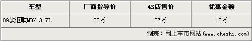 謳歌-MDX于07年4月13日于北京上市,MDX是本田高端品牌謳歌引進(jìn)中國(guó)的第一輛豪華SUV車型。事隔1年有余,小改款的09款謳歌-MDX又被推出,其在08款的基礎(chǔ)上增加了一些實(shí)用性的配件,動(dòng)力方面則沒有任何變動(dòng)。近日據(jù)網(wǎng)上車市價(jià)格數(shù)據(jù)監(jiān)測(cè)顯示,謳歌MDX的現(xiàn)金優(yōu)惠增加到了13萬元,具體詳情請(qǐng)看下表:
