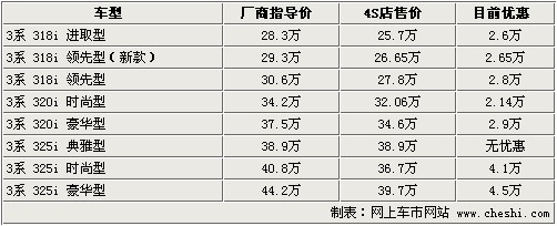 據(jù)4S店銷售人員介紹:寶馬3系推出一款新318i領(lǐng)先型,目前318i領(lǐng)先型共有2款,但是配置有所不同。新款車型相比在售的30.6萬(wàn)元的車型配置有所降低,但是相比318i進(jìn)取型多了幾項(xiàng)實(shí)用配置,但優(yōu)惠后的價(jià)格僅比318i進(jìn)取型價(jià)格高了不足1萬(wàn)元。目前寶馬3系318i全系無(wú)現(xiàn)車,預(yù)定需等到11月底、12月份才能到車,顏色為黑色。320i目前時(shí)尚型有現(xiàn)車,顏色為紅色,豪華型需預(yù)定。寶馬3系全系最高優(yōu)惠4.5萬(wàn)元,相對(duì)優(yōu)惠價(jià)格較穩(wěn)定。