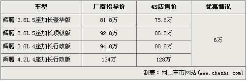 據(jù)北京進口大眾經(jīng)銷店銷售人員介紹,目前輝騰全系有6萬元的現(xiàn)金優(yōu)惠,經(jīng)優(yōu)惠后3.6L 5座加長豪華版的售價降到了75.8萬元。排量稍大的4.2L 4座加長行政版經(jīng)優(yōu)惠后售價從134萬元下降到了128萬元。銷售人員還介紹,4.2L輝騰沒有現(xiàn)車,欲購買的消費者需交訂金10萬元預(yù)訂。