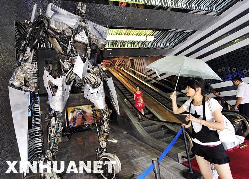 6月23日,觀眾在杭州一家電影院觀看“汽車人”。這個(gè)“汽車人”高逾4米,重達(dá)2噸,由各種廢棄汽車零件焊接組裝而成,是為即將上映的電影《變形金剛2》造勢特別制作的。新華社發(fā)(李忠 攝)