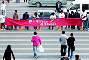 “停下來并不寂寞,跨過去成為傳說。”昨日(27日)上午,中關(guān)村海龍大廈前面的丁字路口,十余名年輕人手持橫幅,在人行道上站成三排,組成“人肉斑馬線”,陪行人一起等紅燈;顒(dòng)的發(fā)起者表示,大家通過網(wǎng)絡(luò)召集,旨在用這種類似行為藝術(shù)的方式,提示人們珍愛生命,勿闖紅燈。