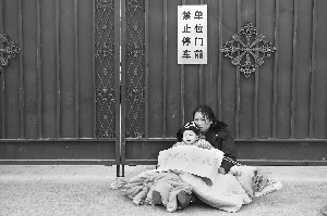 昨日上午,韓麗敏懷抱著一歲半的兒子,坐在鋪在地面的被褥里。她胸前,放著一張寫有“還我丈夫還我車”的硬紙片。