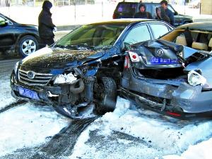 在距離事發(fā)地點(diǎn)不到5米的一家汽車銷售店上班的閻先生稱,事發(fā)時(shí)外面很安靜,他和店里的同事接連聽見兩下撞擊聲,出門就看到慘劇發(fā)生。豐田車的左前側(cè)受損嚴(yán)重,前輪搖搖欲墜。而速騰車和廣本車的車尾部被撞嚴(yán)重,完全癟了進(jìn)去,其中速騰車后備箱里的備胎還被撞了出來!罢厥仑S田車?yán)镉?人,司機(jī)下車后還是鎮(zhèn)定地安撫乘客!遍愊壬f,被撞的男子趴在雪地里,頭上滿是鮮血。隨后999趕到,據(jù)急救人員稱,剛開始男子還有呼吸,但2分鐘之后,男子死亡。