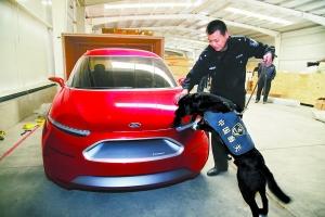 北京國際車展本月25日舉辦,目前空運(yùn)展品已經(jīng)大部分入境。為防止展品中夾藏違禁品,海關(guān)緝毒犬基地派出兩條訓(xùn)練有素的緝毒犬協(xié)助關(guān)員現(xiàn)場(chǎng)查驗(yàn)。張鵬 唐延智攝