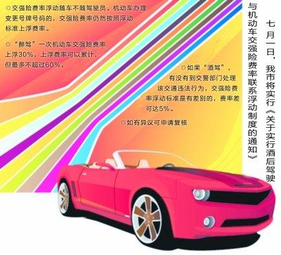 根據(jù)昨日省公安廳印發(fā)《關(guān)于實(shí)行酒后駕駛與機(jī)動(dòng)車交強(qiáng)險(xiǎn)費(fèi)率聯(lián)系浮動(dòng)制度的通知》表明,交強(qiáng)險(xiǎn)費(fèi)率與酒后駕駛交通違法行為相聯(lián)系的浮動(dòng)標(biāo)準(zhǔn)已經(jīng)明確,交強(qiáng)險(xiǎn)費(fèi)率浮動(dòng)隨車不隨駕駛員。記者從市交警支隊(duì)獲悉,7月1日起,我市將開始實(shí)施。