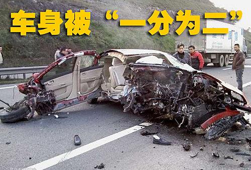 車頭受損非常嚴(yán)重,已經(jīng)面目全非,在左側(cè)基本已經(jīng)無法看出這是一輛什么品牌的汽車。副駕駛席的乘客被甩出車外,鞋子留在了路上。因?yàn)樽矒酎c(diǎn)在副駕駛員一側(cè),駕駛員一側(cè)留有安全的空間,所以駕駛員并無生命危險。