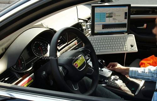 最近諜照記者設(shè)法拍到了奧迪新一代A8的內(nèi)裝照片。雖然這輛測試車的內(nèi)裝混合了現(xiàn)行版和下一代車型的內(nèi)裝配置,但仍能看出新車采用了新的方向盤,經(jīng)過升級的儀表群以及造型古怪的變速桿,它或許可以提供包括自動泊車等先進功能。測試人員右側(cè)放置的電腦顯示了新車正在測試的是車輛監(jiān)測技術(shù),該技術(shù)利用攝像頭和傳感器來探測車輛是否處于可能與其他車輛發(fā)生碰撞的危險環(huán)境中。