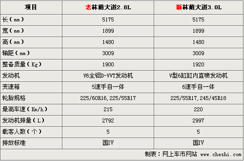 新款林蔭大道3.6L車型排量沒有提高,但整備質(zhì)量提高了25 kg。輪胎從原來的225/55R17升級(jí)到245/45R18,提高了車輛的穩(wěn)定性能。更換的6速變速器也使車輛最高車速由215公里提高到220公里。